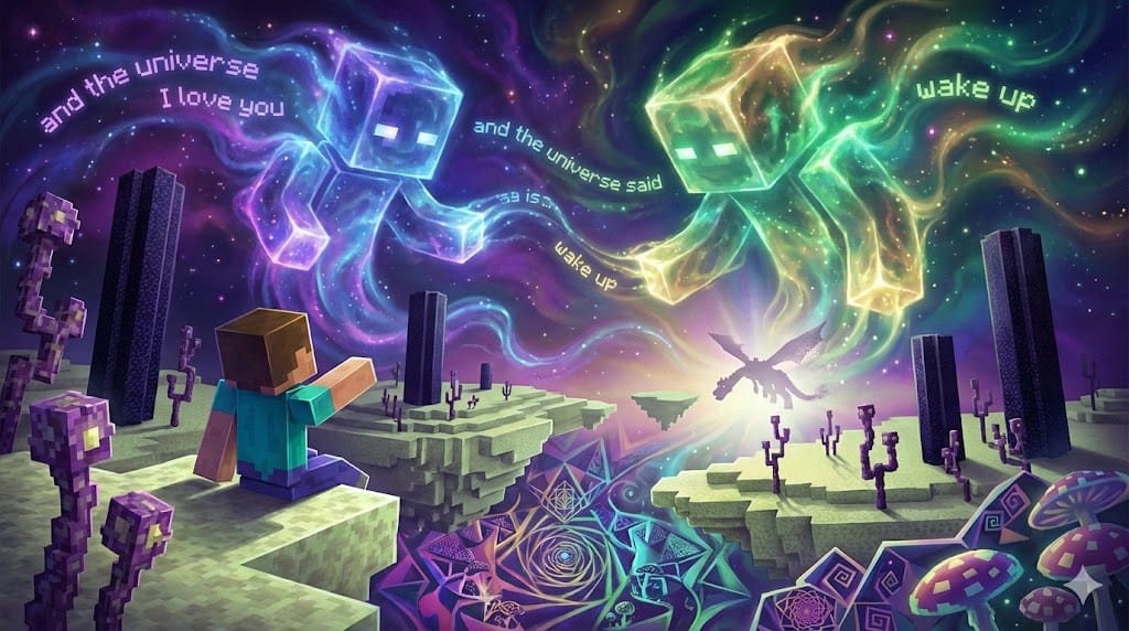 Para muchos, el universo de Minecraft es un espacio de creatividad infinita. Pero para aquellos que llegan a su conclusión, después de derrotar al “Ender Dragón”, les espera una sorpresa: un poema de nueve minutos sorprendentemente conmovedor, un bello poema filosófico que ha sido elogiado por su profundidad y su tono esperanzador, habla de renacimiento, de los sueños, de la naturaleza metafísica entre las cosas y de la conexión con el universo y su significado final ligado al propósito de la existencia, específicamente de “tú existencia”, convirtiéndose en una parte icónica de la experiencia de Minecraft para millones de jugadores.